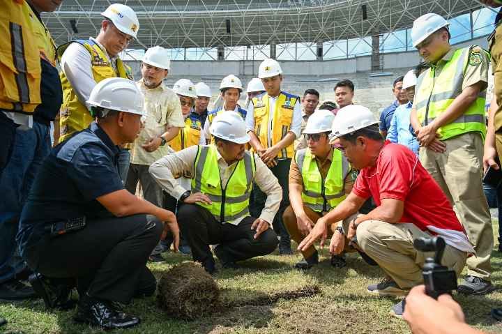 “Rumput OK, hanya kering saja karena dalam masa pembangunan, masalah kelembapannya saja, estimasi dalam waktu 30 hari bisa bagus, bisa standar. Untuk fisik, ada dua ya, ada APBN ada APBD, yang APBN kita harapkan bisa segera selesai dan ini bisa rampung di bulan Mei,” kata Bobby Nasution usai peninjauan, Selasa (31/3/2026).